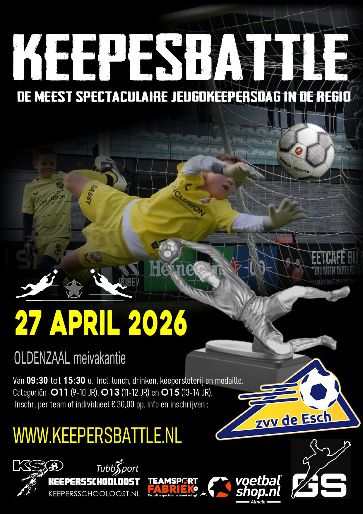 Een keepersbattle is het meest favoriete spelonderdeel van iedere keep(st)er. Anders dan bij reguliere keepersdagen, waarbij het accent ligt op de training, wordt tijdens een keepersbattle, in teams van 2 tot 3 keep(st)ers, een hele dag gestreden tegen andere battleteams uit de regio of elders uit Nederland. Keep(st)ers in de leeftijd van 9 tot en met 16 jaar, prestatief of recreatief, kunnen deelnemen aan een keepersbattle. Tijdens een geheel verzorgde dag kunnen zij zich uitleven in de onderlinge battles, die garant staan voor vele reddingen maar ook de nodige doelpunten! Tijdens een keepersbattle ontvangen de deelnemers voldoende drinken en een gezonde lunch en niemand gaat met lege handen naar huis. De deelnemers doen verder GRATIS mee aan een keepersloterij en ontvangen aan het eind van de dag een herinneringsmedaille.