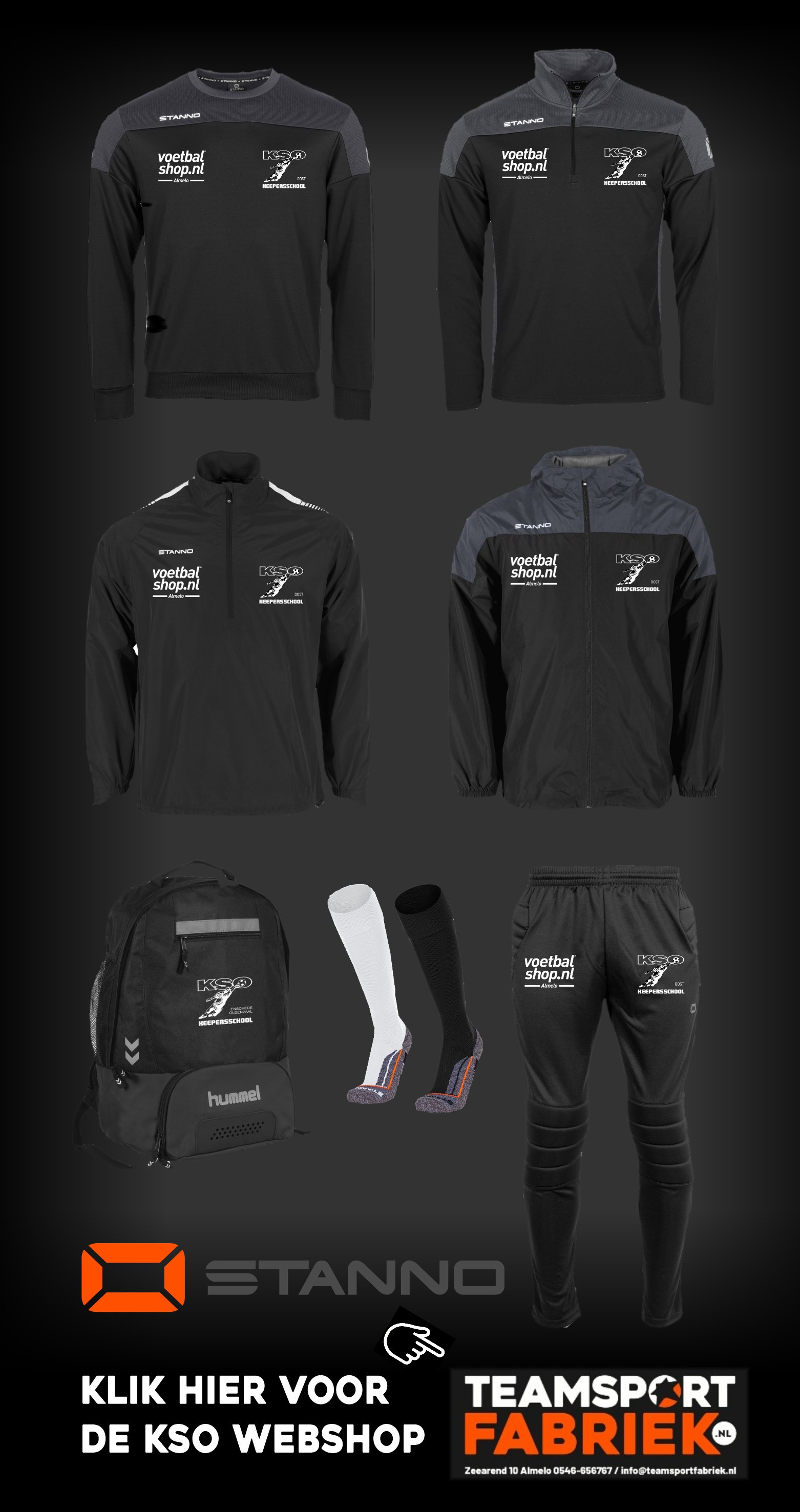KSO trainit in uniforme trainingskleding en bestaat uit een zwart KSO-keepershirt / KSO-trainingstop en een zwarte lange KSO-keepersbroek. Het keepershirt is verkrijgbaar via de coordinator van KSO en kan tijdens iedere training eerst gepast worden. De overige trainingskleding, zoals hieronder afgebeeld, kan besteld worden via de webshop. Levertijd keepershirt 1 - 2 weken.